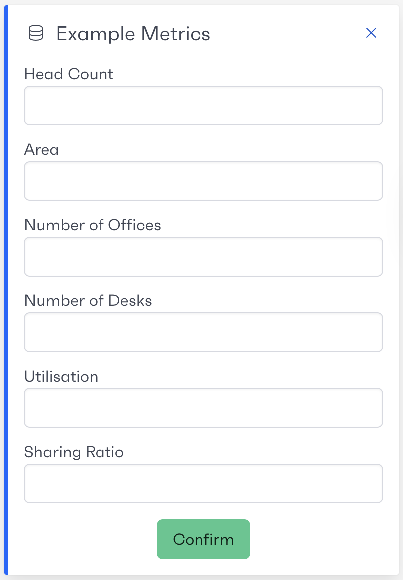 Metrics are a way of capturing project-specific data. An example would be capturing a single building's information, where you might want to record the number of employees at the building, the Sqft, number of workstations etc.