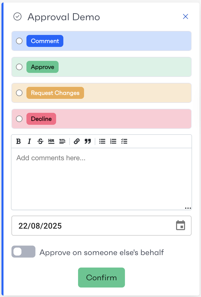 Approvals are a way of gauging the approval of one or many users on the workflow. They can have a list of configurable statuses such as Approved, Declined, Changes Requested, etc. They can also be configured to allow approval on behalf of someone else (useful if that person does not have access to the system).