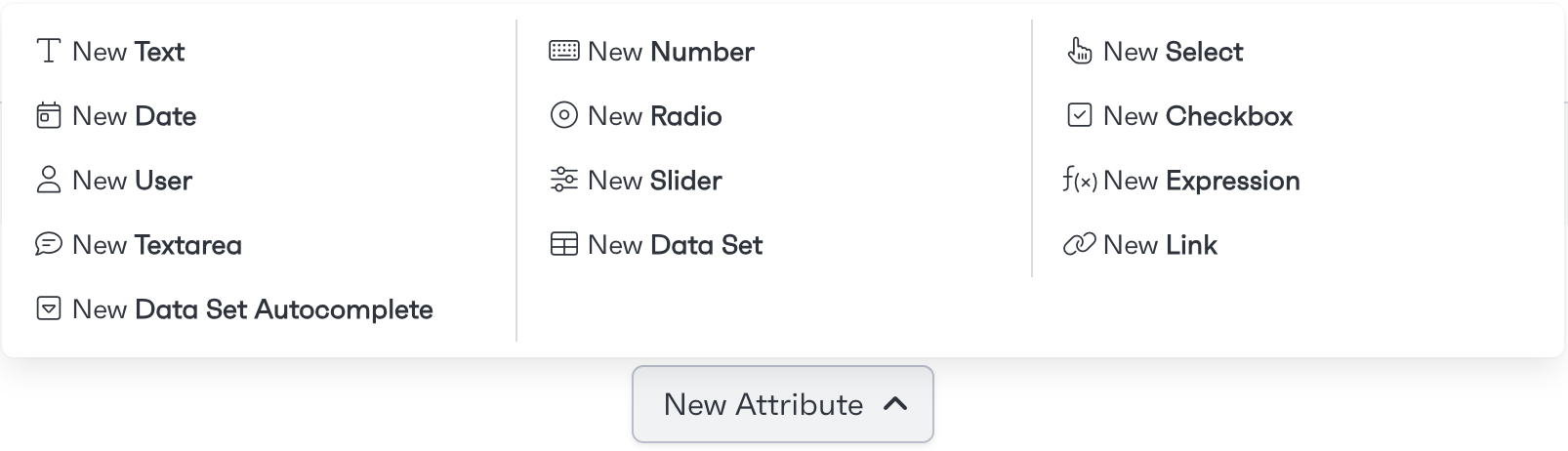 To create a new attribute, navigate to the New Attribute page with the navigation bar, once you are on the New Attribute page, select the attribute type you are looking to create with the menu. These attributes are utilised for a number of different use cases and data types which will be displayed in a programme.