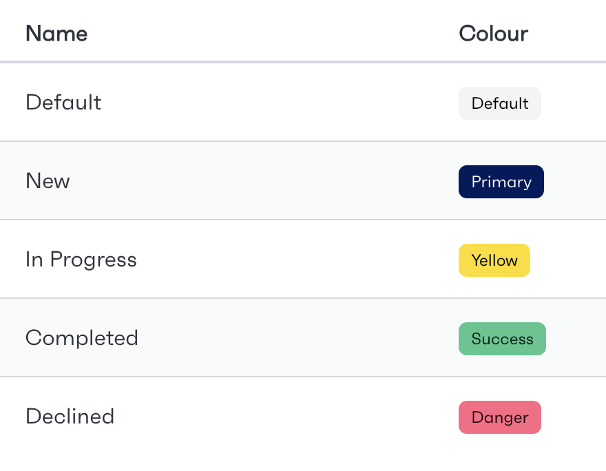 A standard set of statuses are pre-loaded when creating a programme. When creating a new status, you will be required to enter the name and colour associated with this status.
