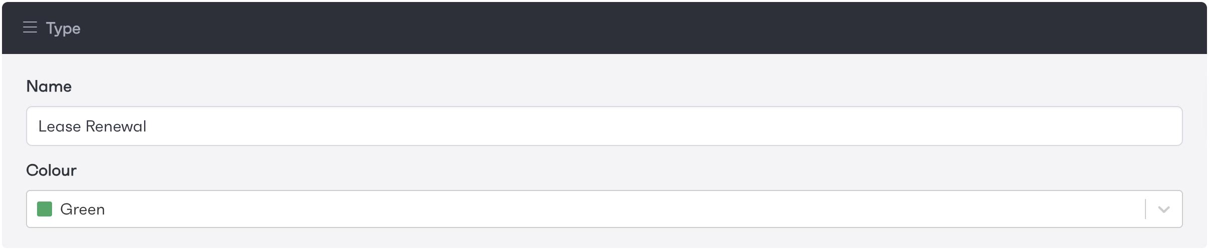 To create a new type, navigate to the new type page using the navigation bar. Once on this page, you will be able to start the creation of a type. These will be used on workflows and programmes to show information to be seen quickly, where required. You will be required to enter the name and colour associated with the type before creating one.