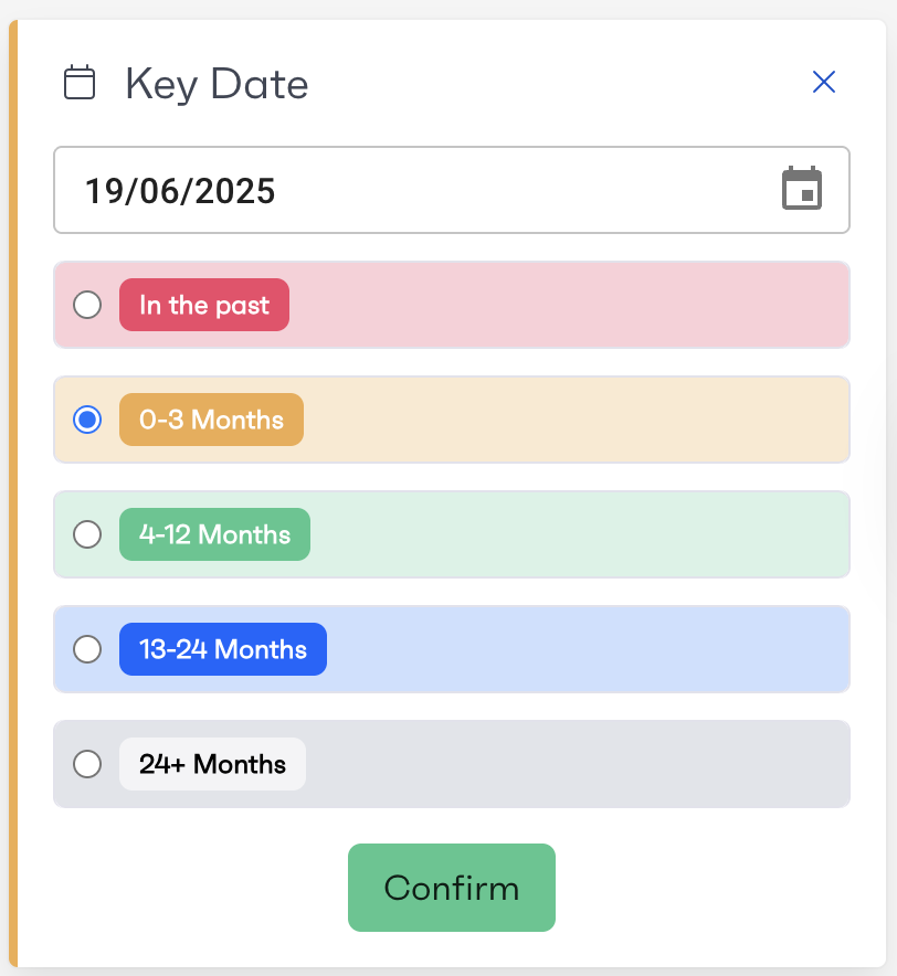 Dates can be used in the system to either mark when an activity has been completed or to schedule it. Date activities can be used to drive a bar chart on the workflows overview page, displaying the number of upcoming dates grouped by week.