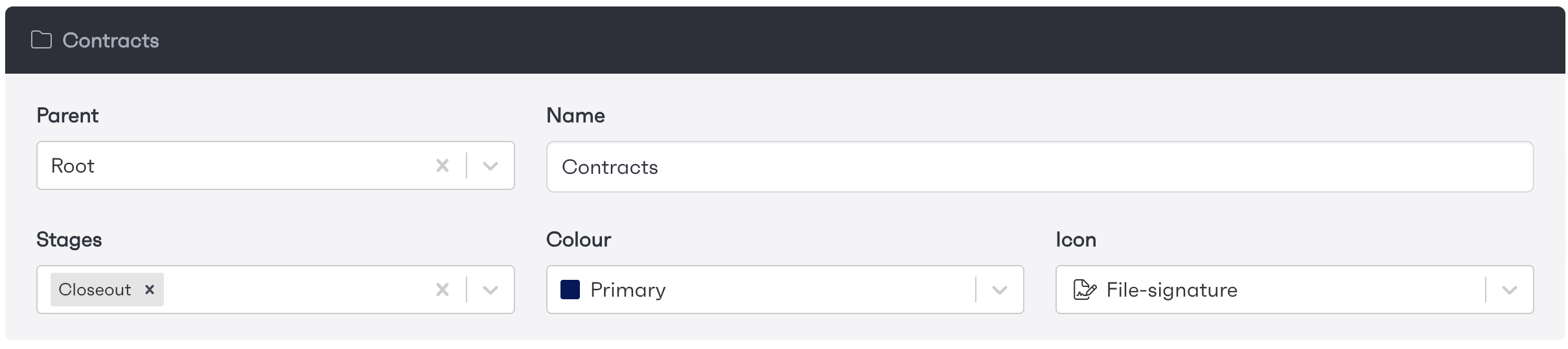 If you would like to amend any of the existing folders, clicking on the ‘Edit’ button to the right of the folder allows you to update specific settings. This includes the folder name, colour and icon, alongside the parent folder and the stages the folder is available. Permissions can be configured so only specified roles can access certain folders.