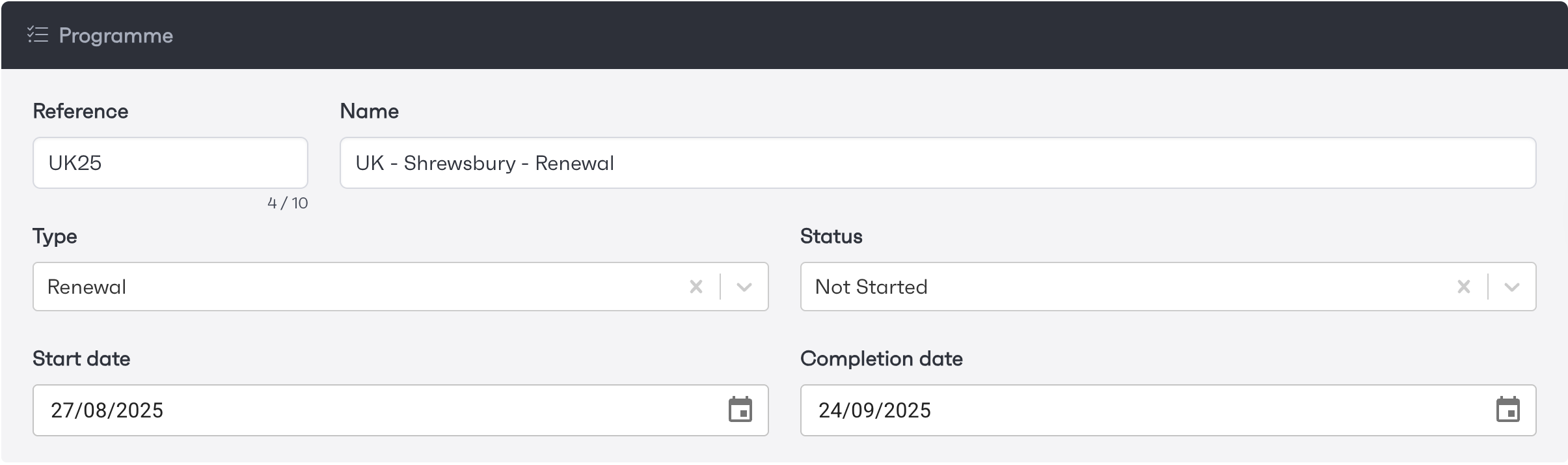 Once you create your programme, you will be required to enter some project details before proceeding. This will include, name, status, start and estimated completion date. These fields are comprised of text entries, dropdown selects and date pickers.